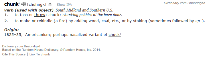 “Chunk me that book.” “I chunked it in the trash.” “I don’t trust you any farther than I can chunk you.” (Okay, so maybe not that last one, but you get the idea.)